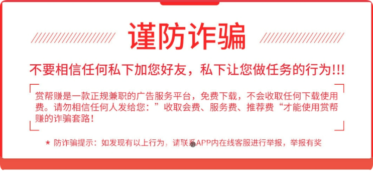 新手注册送红包,赶紧加入“赏帮赚”。注册送1元,完成新手任务送9元,赏帮赚每天一万多个悬赏,随时随地,躺在家里,轻松手机赚钱!悬赏任务单价高,任务多简单易赚,动动手指就能赚钱的好软件,邀请您的好友注册赏帮赚,永久享12%提成奖励+2元邀请奖。多样的悬赏类型:调查问卷,数据(图片、音频、文本)等等,让你轻松赚到钱;红包团、赏金券,创意丰富的玩法让你体验更多的赚钱乐趣。